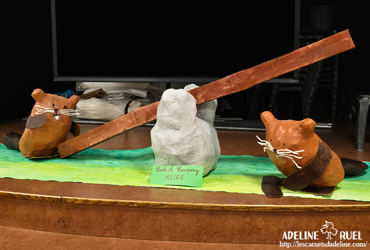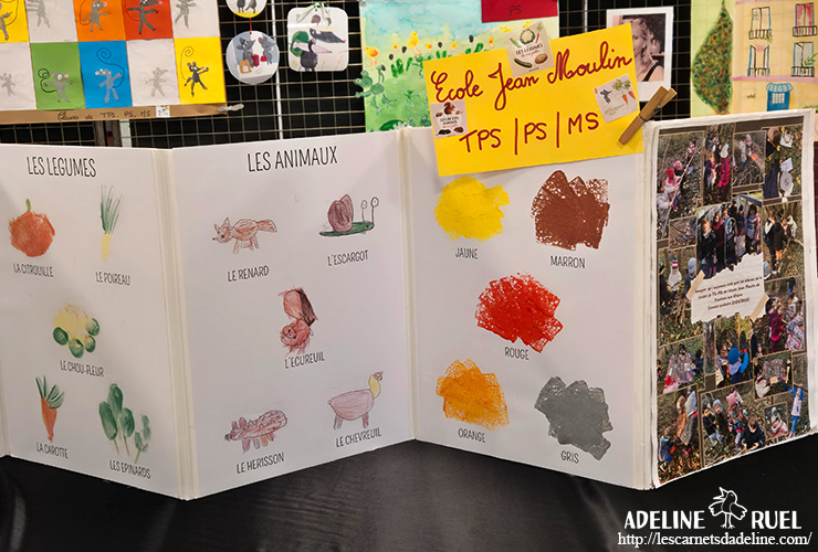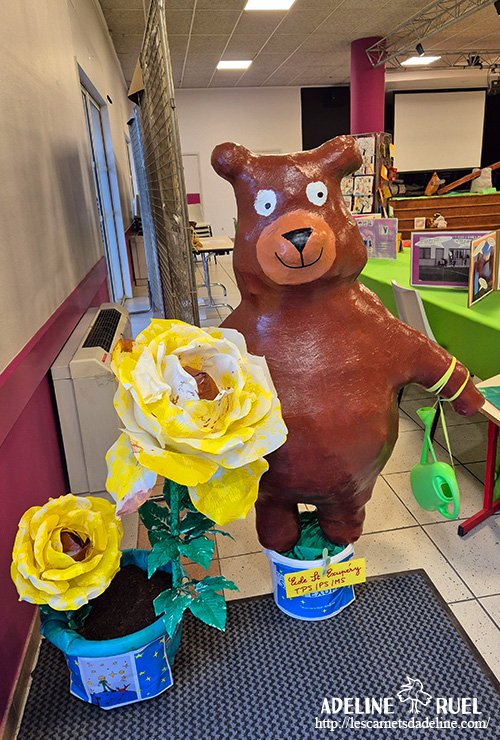 Les élèves et enseignants des écoles ont fait un travail incroyable en amont ! Je découvre avec émotions leurs créations lors du salon du livre. Un Gros ours géant accueille les visiteurs… (inspiré de mon livre « Gros Ours jardine » chez Minedition)